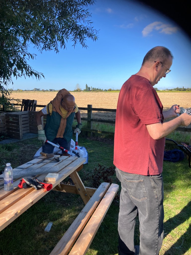 Brendan and Ian clearing overgrown branches and making compost bins at Gosberton